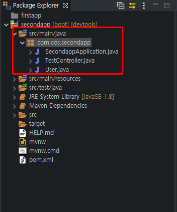 첫 프로젝트 실행 시 src/main/java 안에 있는 com.cos.secondapp 패키지를 컴포넌트 스캔을 해서 IOC 컨테이너에 객체를 등록을 합니다. com.cos.secondapp 패키지만 스캔을 하는 이유는 여기에 Java파일들이 다 들어있기 때문입니다.