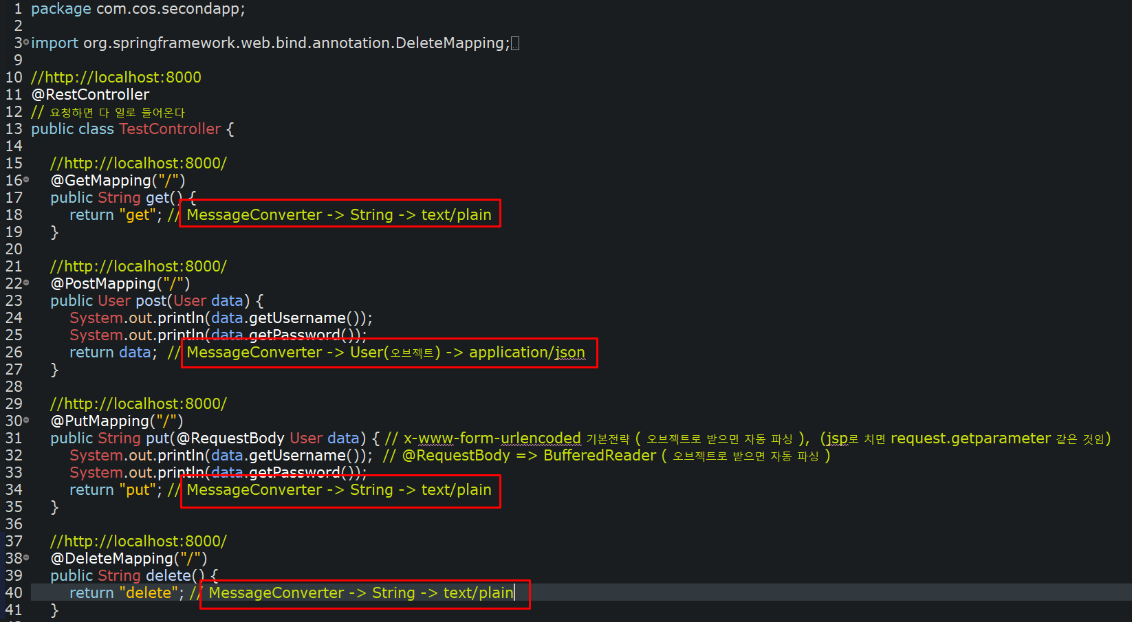그래서 MessageConverter(메시지 컨버터)로 기본 content-type은 text/plain으로 converter(컨버터)하며