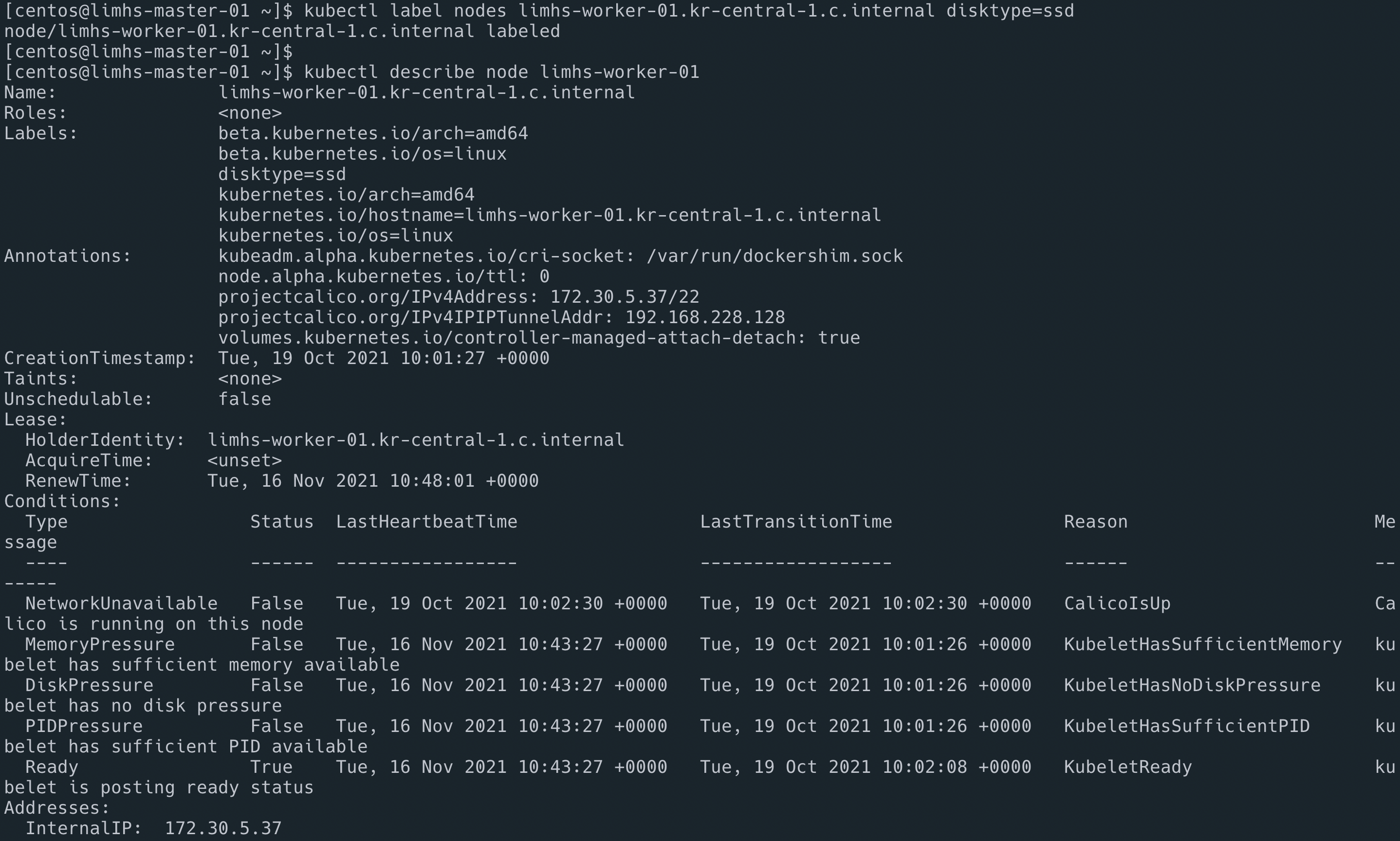 (kubectl label nodes limhs-worker-01.kr-central-1.c.internal disk_type=ssd)
