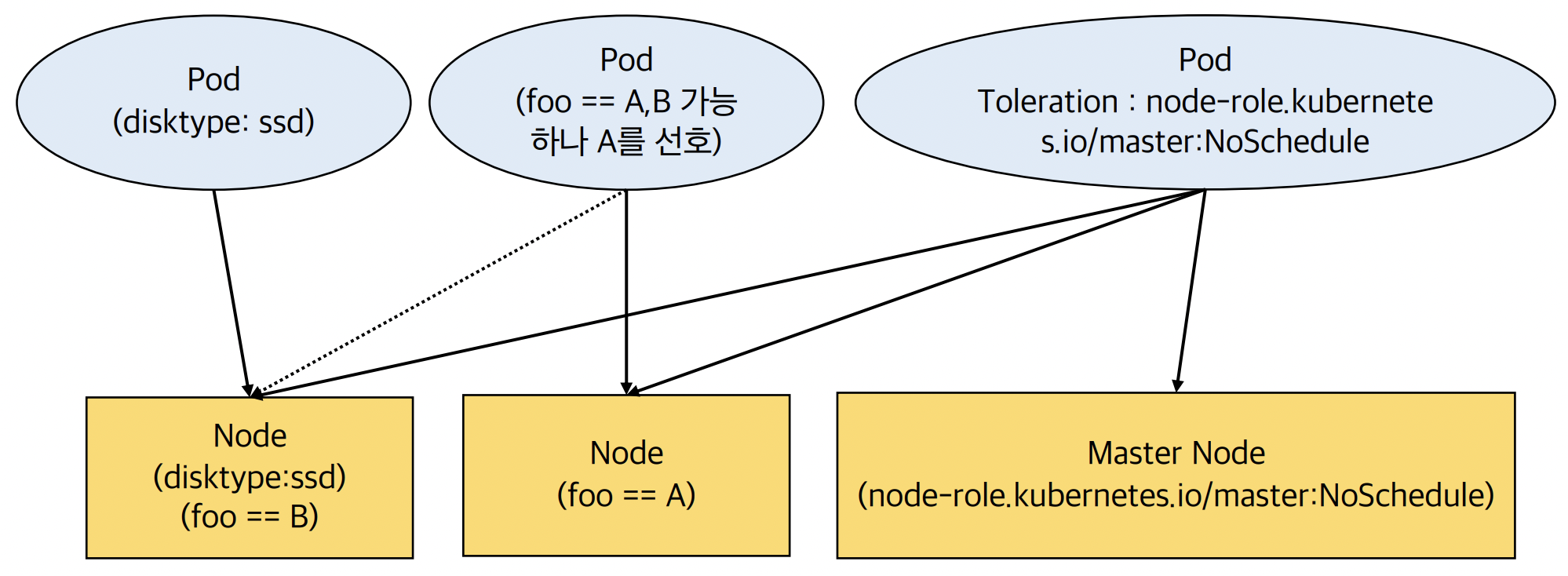 - 복잡한 선택에는 Affinity가 유연. (ex) 레이블 foo이면 A 또는 B 노드를 선택해주세요.