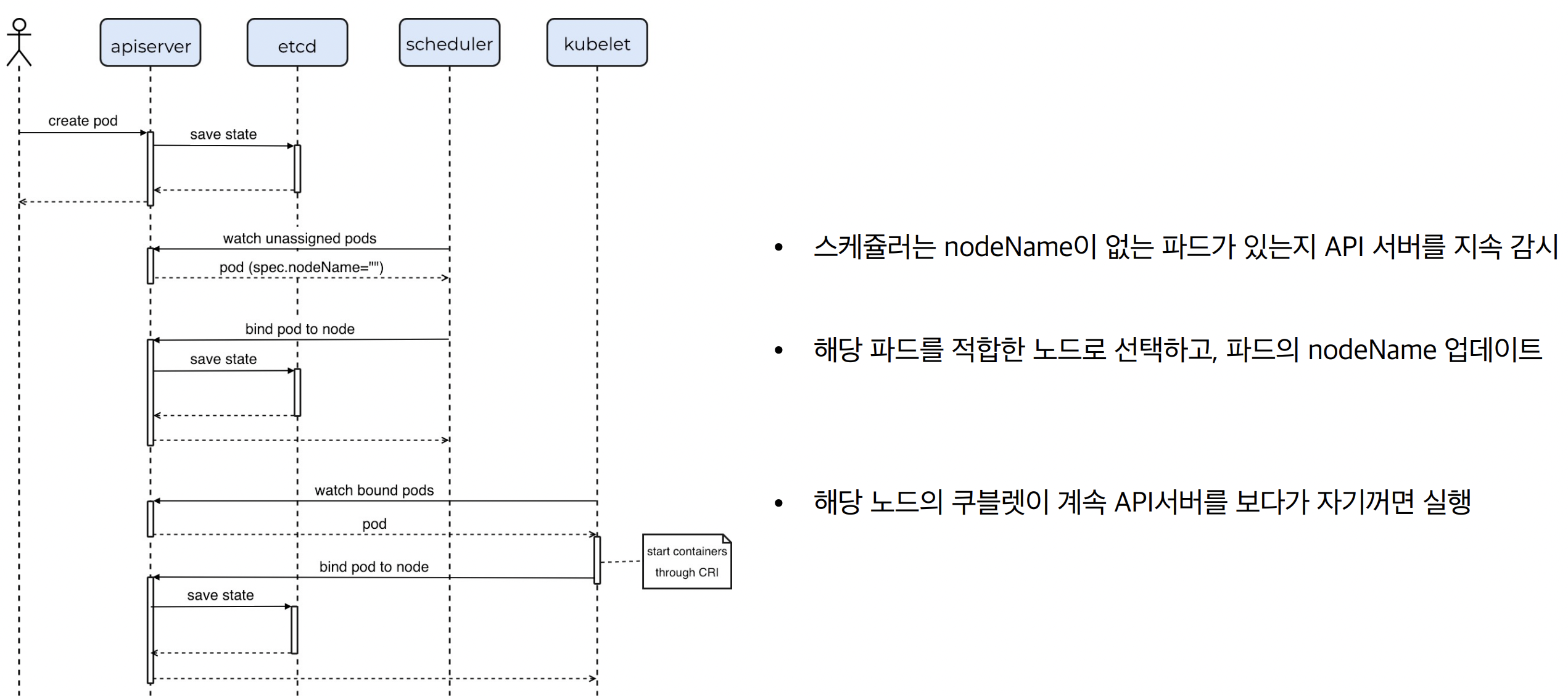 ※ 스케줄링은 한순간에만 최적이므로, 이후 충돌 등 여러 이유로 실행 중인 파드를 이동할 수 도 있음. 이 경우 해당 pod를 삭제하고 재 생성