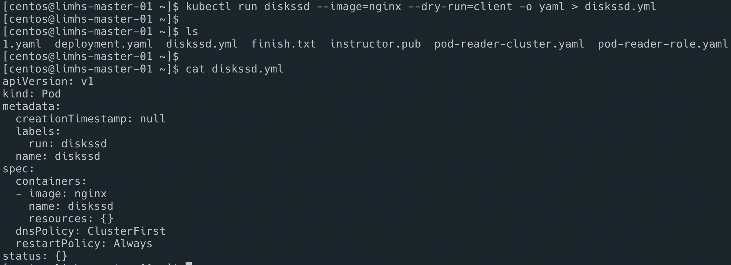 kubectl run diskssd --image=nginx --dry-run=client -o yaml > diskssd.yaml(아래 사진은 오타이다)