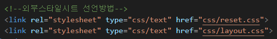 외부 스타일시트 선언 방법으로는 외부 css파일을 가지고 오는 방법이 있습니다.