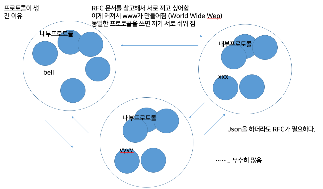 대학에서 교수님들끼리 논문 교류를 하기 위해서 작게 시작한 네트워크가, 다른 대학들도 서로 정보 교류를 하고 싶어서 작은 네트워크가 커지기 시작합니다. 연결을 할 때 서로 약속을 정하는 거죠! 이것이 Protocol이 생겨난 이유입니다. 각자의 내부 Protocol이 다르기 때문에, 다른 외부와는 연결이 힘들죠, 그렇지만 RFC라는 국제 Protocol의 표준을 만들어서 외부 Protocol을 통일을 시켜, 외부 통신을 원활하게 합니다.
