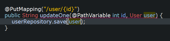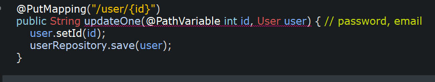 그리고 그 넣은 것의 메서드 setPassword와 setEmail을 <이 메서드는 user안에 있는 값을 수정하는 user객체에 들어있는 메서드임> 사용하여 그 안에 (유저가 다시 입력한 User user 매개변수 안에 있는 것) user의 요청 값을 넣습니다.