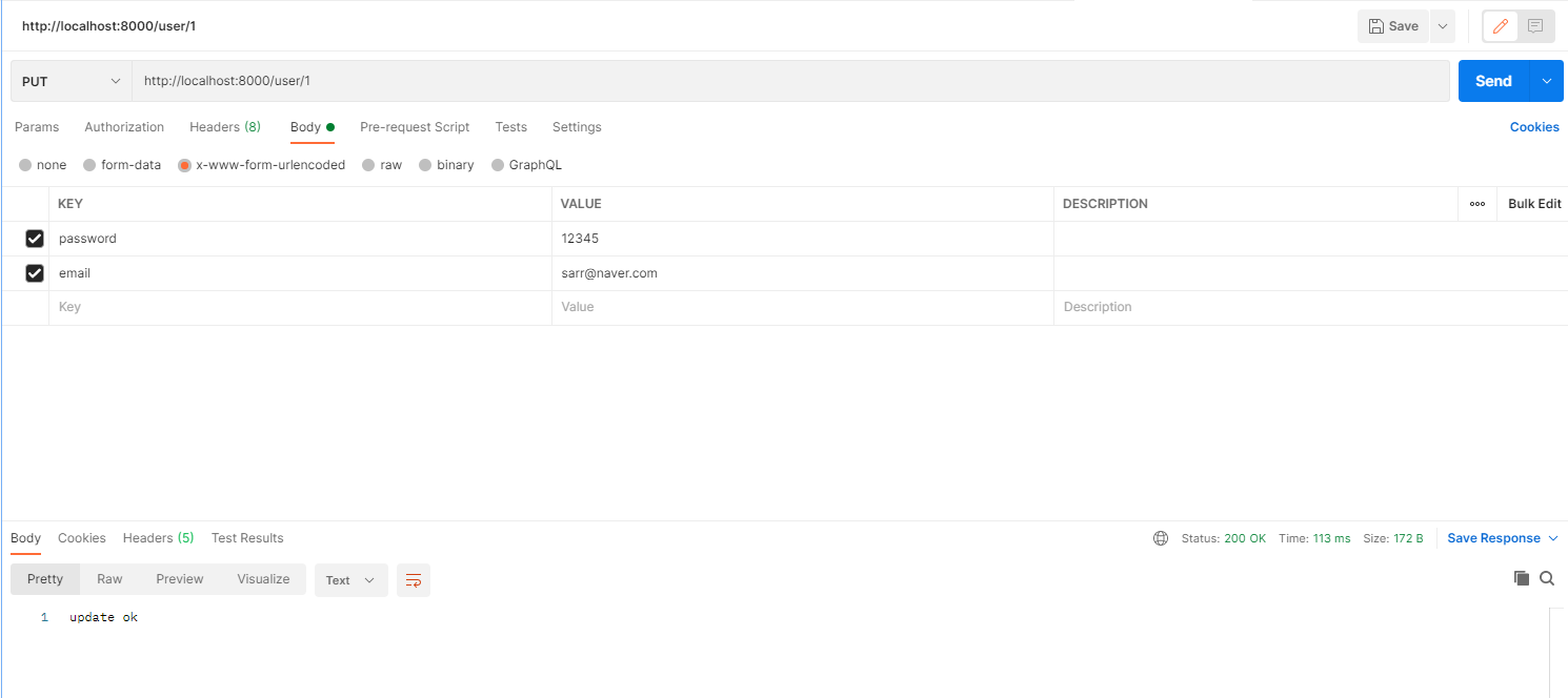 그리고 수정할 것을 (raw, json, x-www-form등) body에 들고 갑니다.