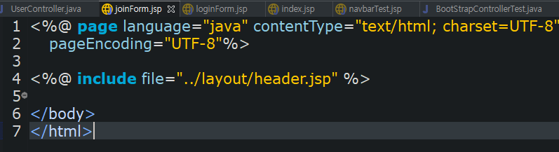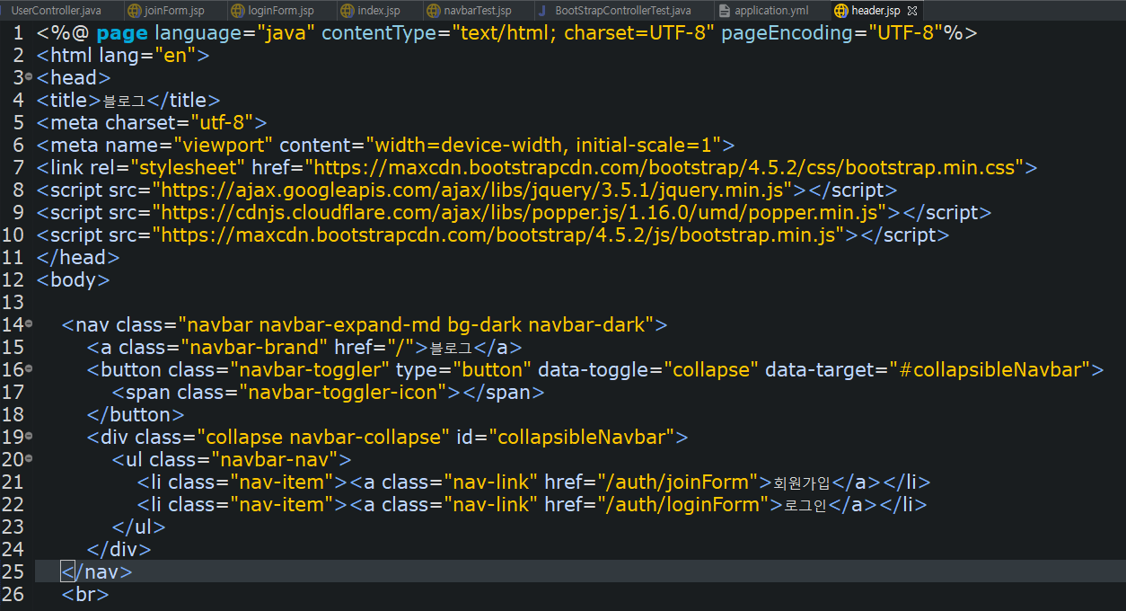 아래는 navbarTest.jsp의 코드를 가져와서 header.jsp를 만든 모습입니다.