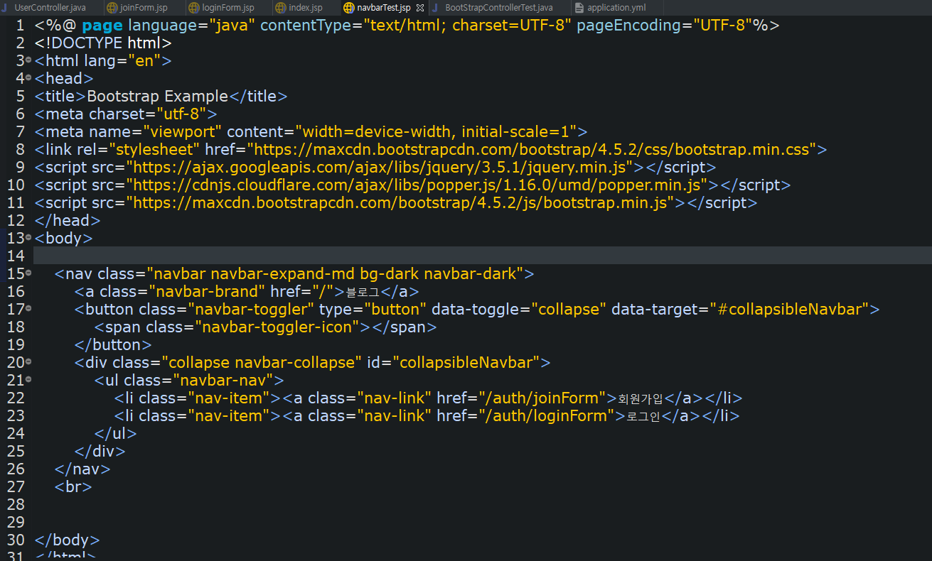 비어있는 jsp 파일(navbarTest.jsp)에서 밑에 사진처럼 윗부분만을 남기고 밑에 부분은 삭제합니다.