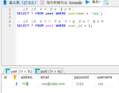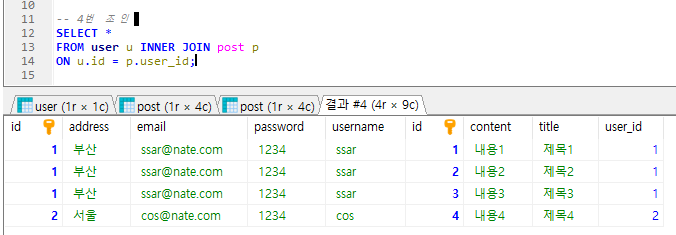 SELECT u.id, u.address, u.eamil, u.password, u.username, p.id, p.content, p.title를 써서 두 개의 테이블을 붙인 모습