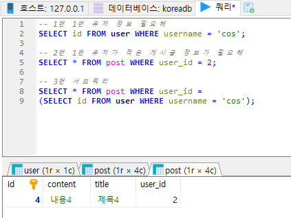 서브 쿼리는 한 번에 한 줄로 끝내서 바로 동작을 하는 방식입니다.