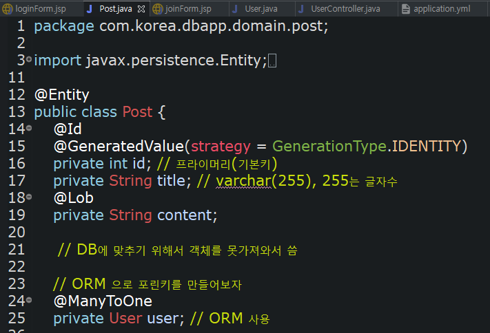 유저 오브젝트 안의 프라이머리 키가 자동적으로 Post의 포린 키로 만들어줍니다.