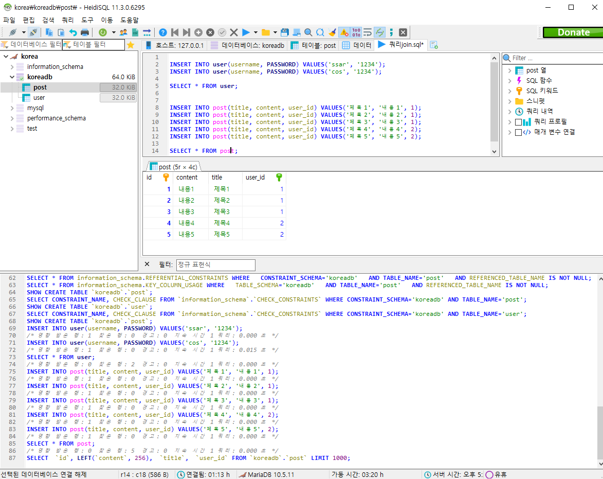 그리고 아래와 같이 HeidiSQL에 접속하여 쿼리문 작성을 합니다
