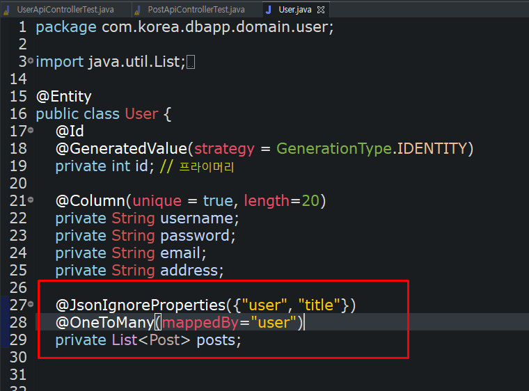 -> 여기서 userEntity에는 posts항목이 들어가 있지 않습니다.