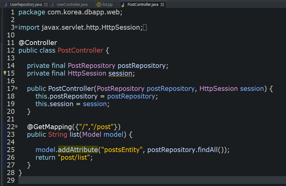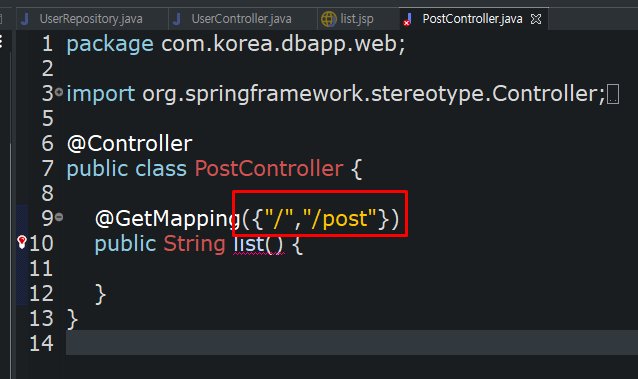 새롭게 컨트롤러에도 list를 핸들링할 수 있게 PostController도 만들어줍니다.