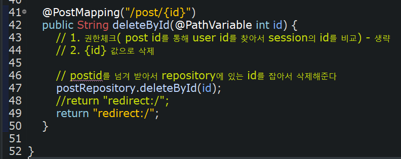 바로 제가 45번째 줄인 delete문만 추가해주고 model에 담아서 주지 않아서 그런 것입니다.