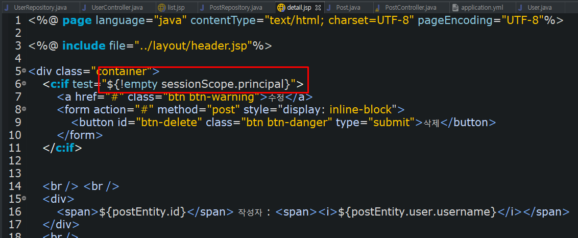 postEntity.user.id는 우리가 컨트롤러를 만들어주어 postEntity를 detail에 넘겨주게 됩니다.