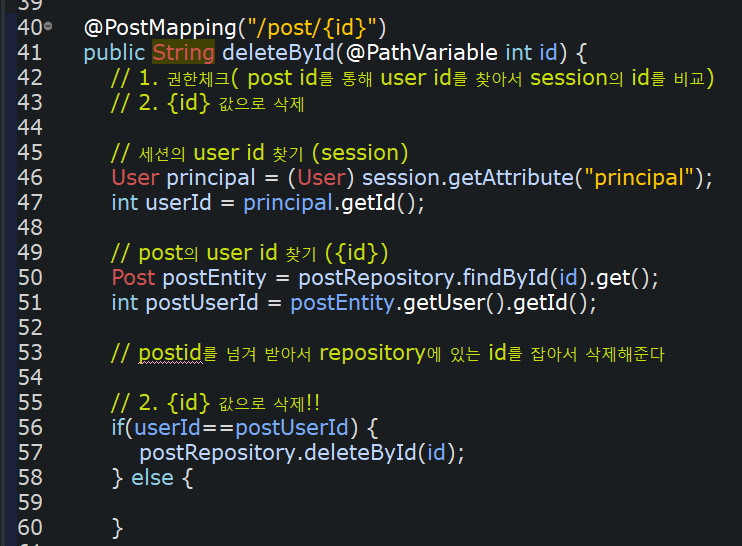 그리고 넘겨받은 postEntity에는 user값이 담겨있으며, 그 유저의 id를 가져옵니다.