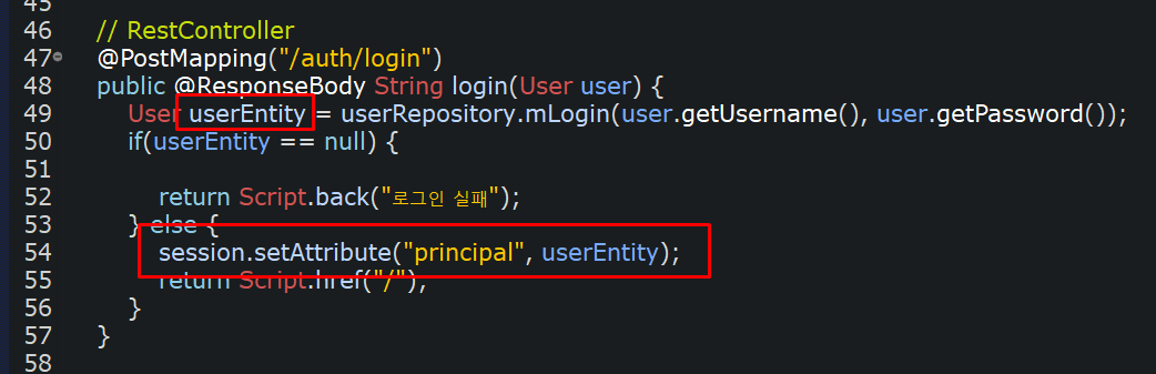 바로 로그인을 해야지 principal이 생기며, 이 principal은 session에 담겨있습니다.