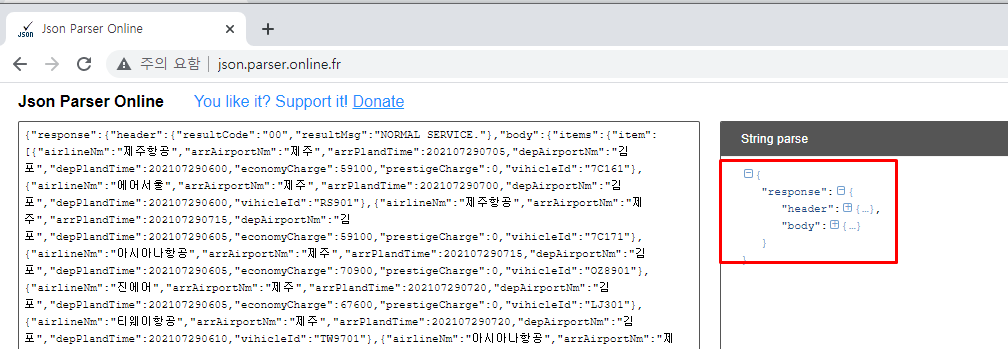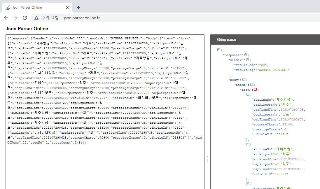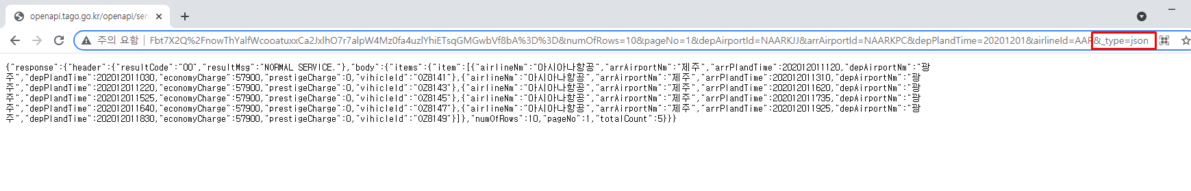 json 객체로 받아오게 다음과 같이 url뒤에 추가해줍니다.