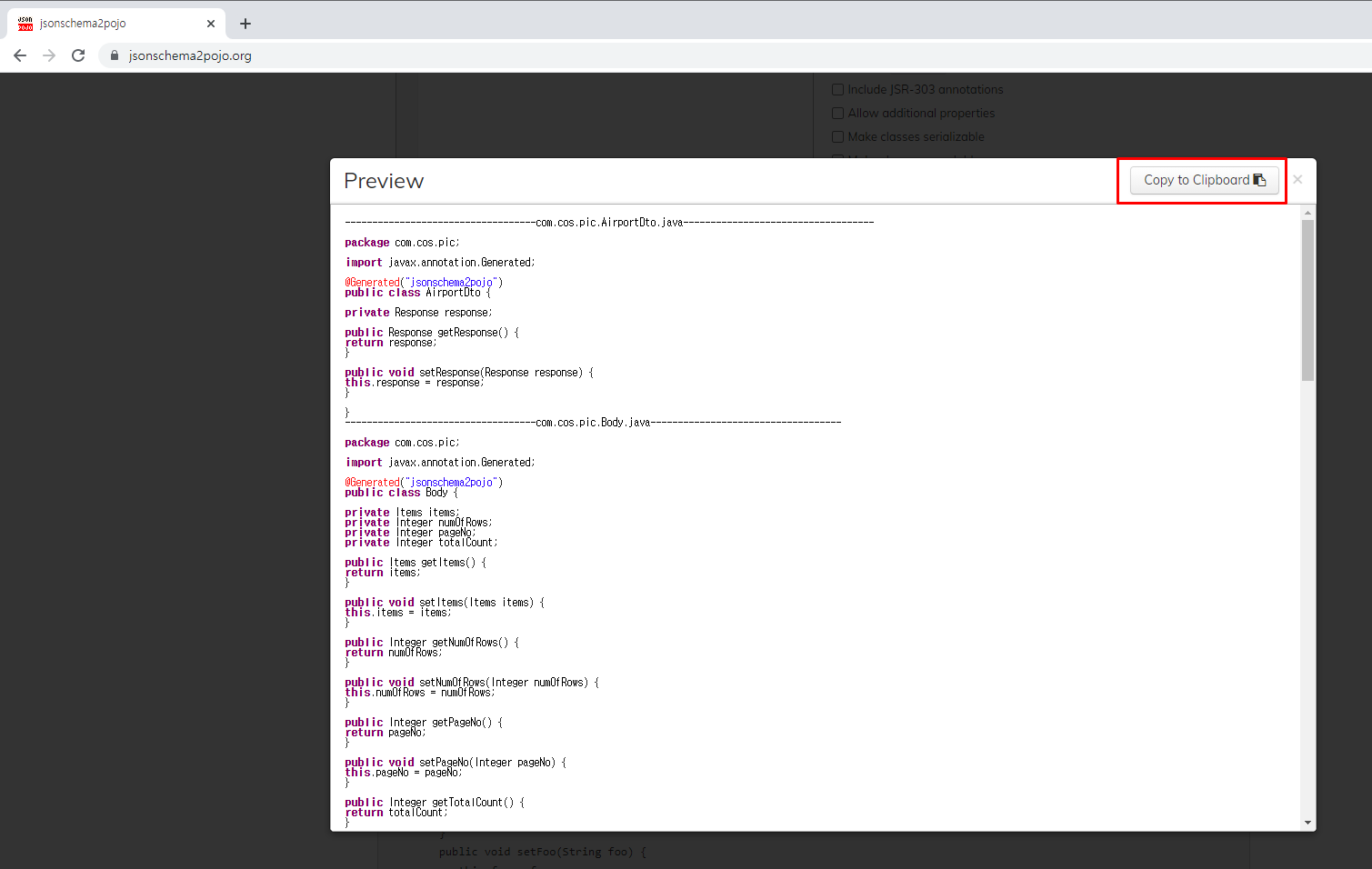 전체를 복사해서 DTO class에 넣어줍니다.
