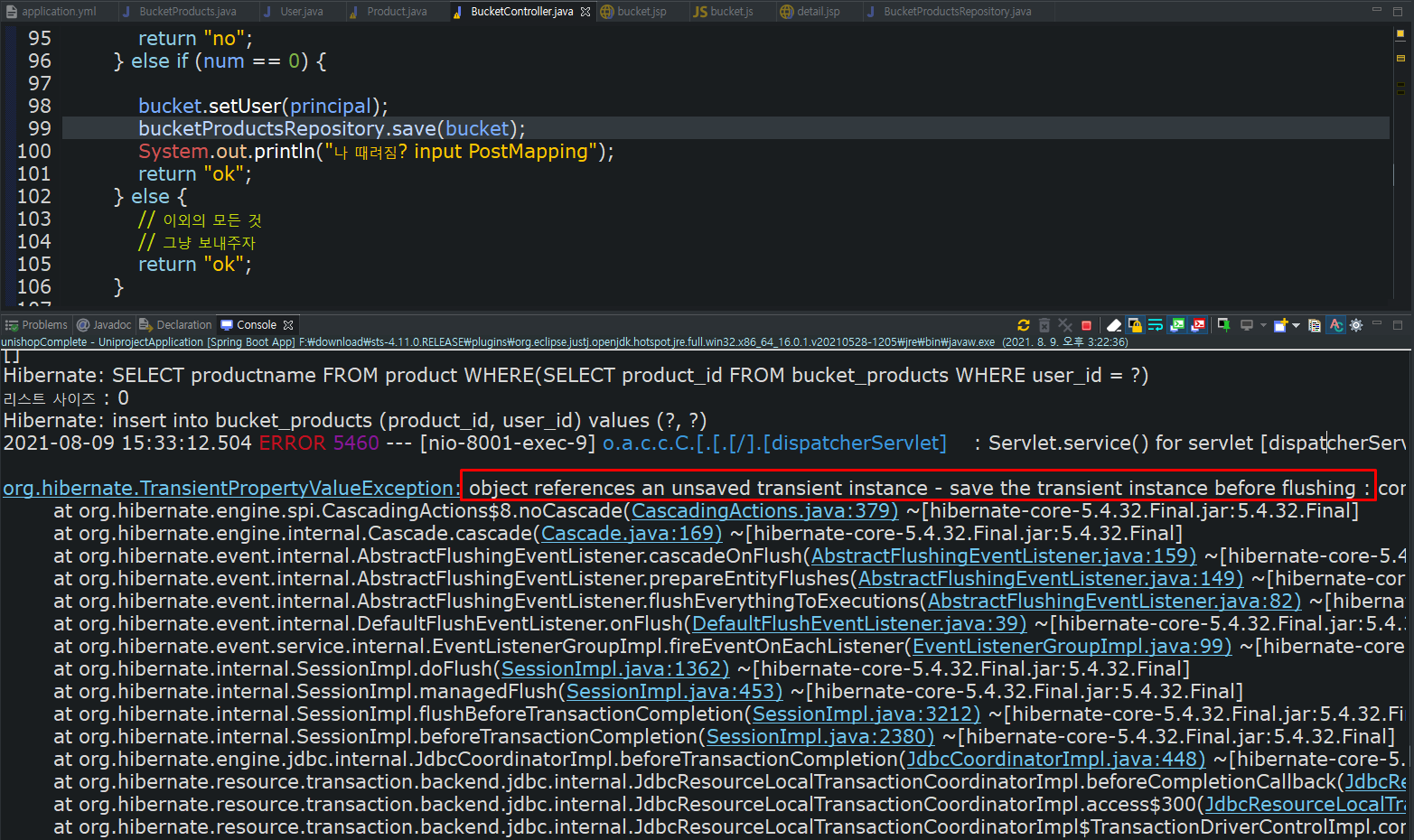 object references an unsaved transient instance - save the transient instance before flushing : com.cos.unishop.domain.bucket.BucketProducts.product -> com.cos.unishop.domain.product.Product