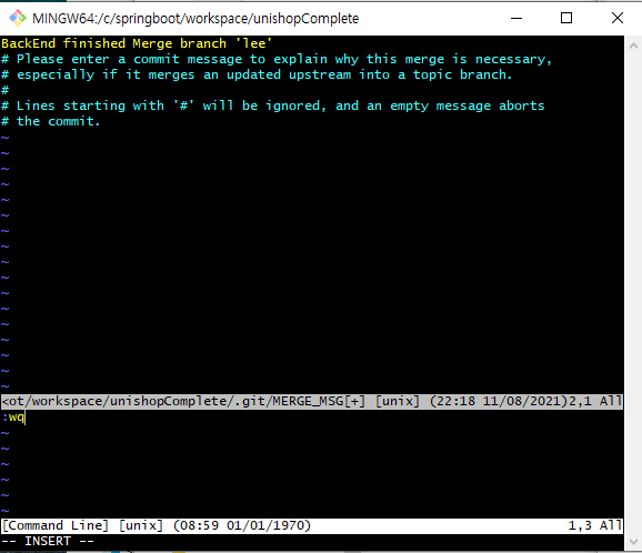 단축키 'i'로 입력 모드로 바꿔 merge commit message를 입력하고