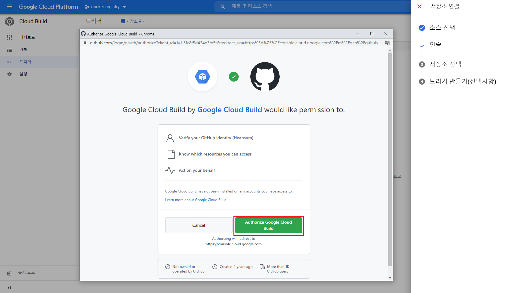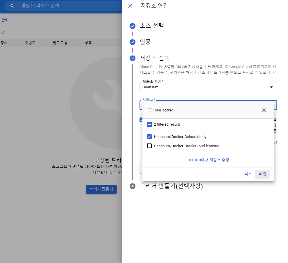 GCP의 Cloud Build 기능을 적용할 저장소를 선택하고 확인 버튼을 누릅니다.