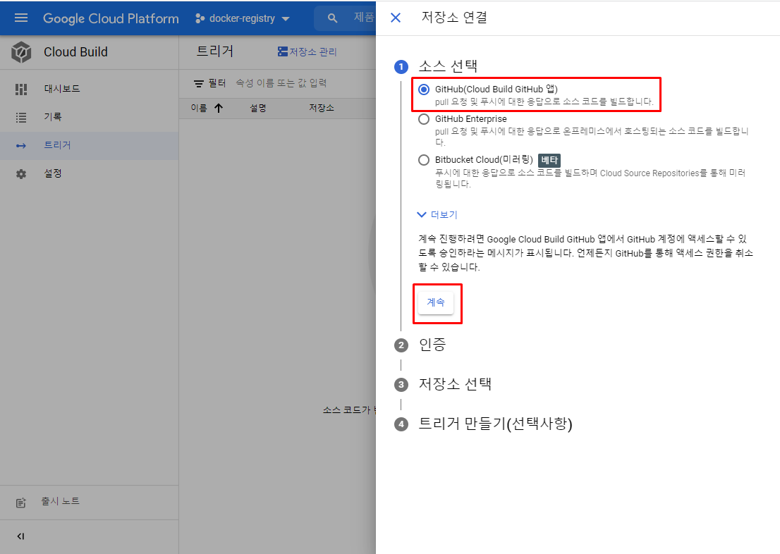 github의 push 내역을 가져오기 위해 Google Cloud Build 설치를 누릅니다.