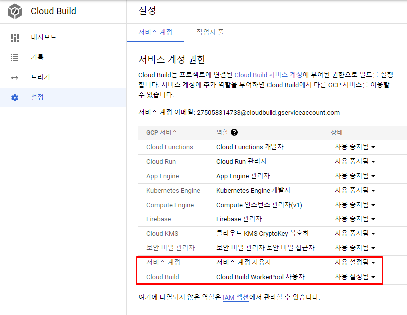 Cloud Build 설정의 서비스 계정 탭에서 표시된 두 항목을 '사용 설정됨' 상태로 변경해줍니다.
