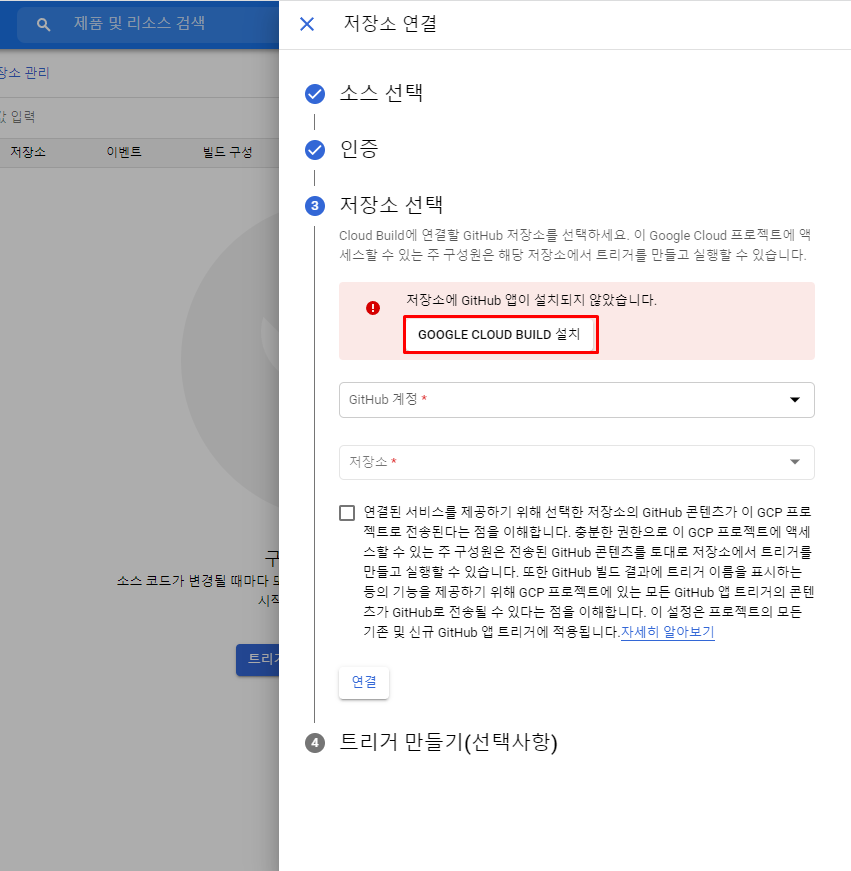 로그인 후 Google Cloud Build와 github 계정을 연동하는 여부를 묻는 창이 나오게 됩니다.