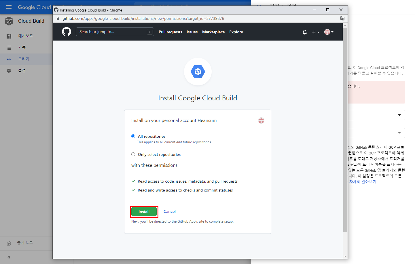 계정에 생성된 저장소 전체에 Google Cloud Build를 적용하려면 All repositories, 특정 저장소만 선택하는 경우 Only Select repositories를 선택한 후 Install을 클릭합니다.