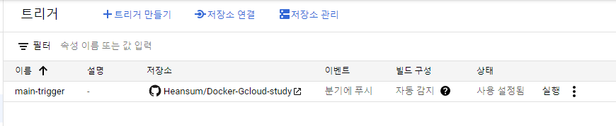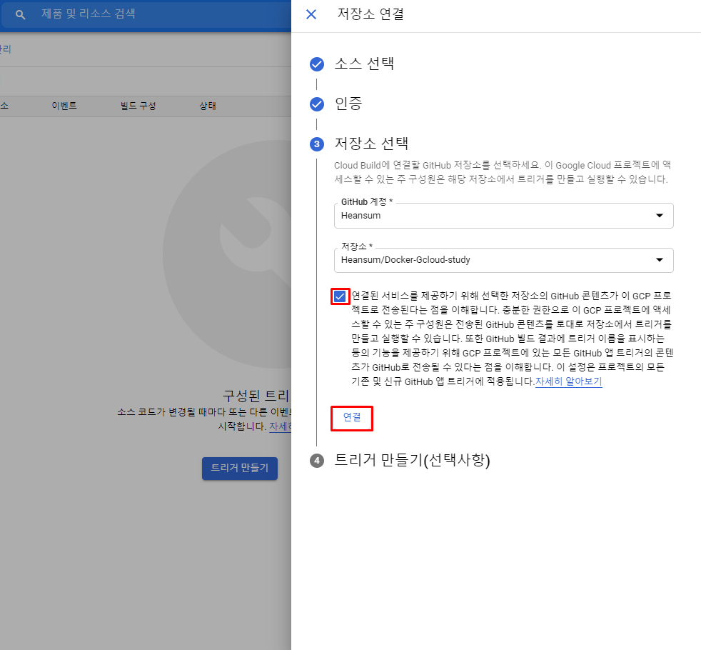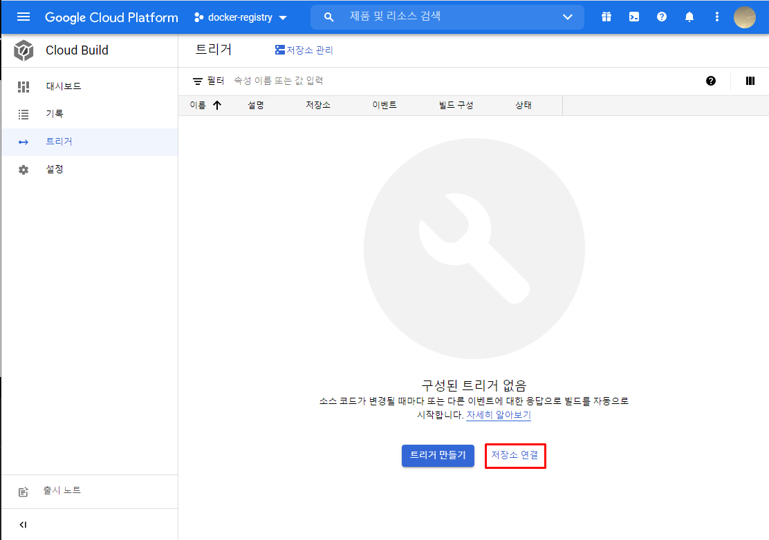 'Cloud Build' 메뉴에서 '트리거'를 누른 후 저장소 연결 버튼을 이어 누릅니다.