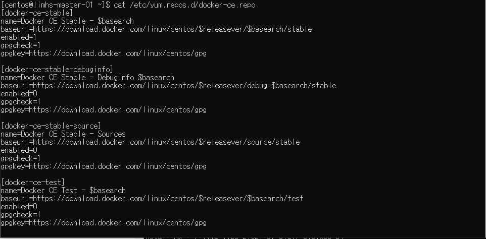 (cat /etc/yum.repos.d/docker-ce.repo 로 확인)