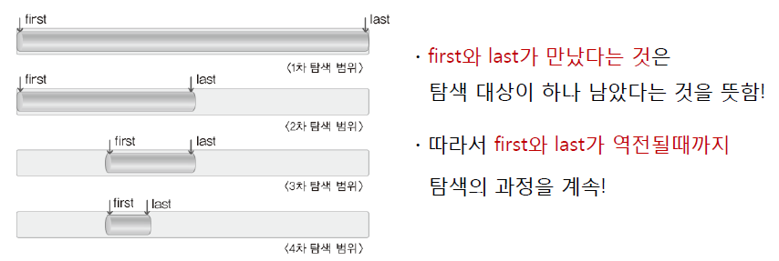 이진 탐색의 매 과정마다 탐색의 대상을 반씩 줄여나가기 때문에 순차 탐색보다 비교적 좋은 성능을 보인다.
