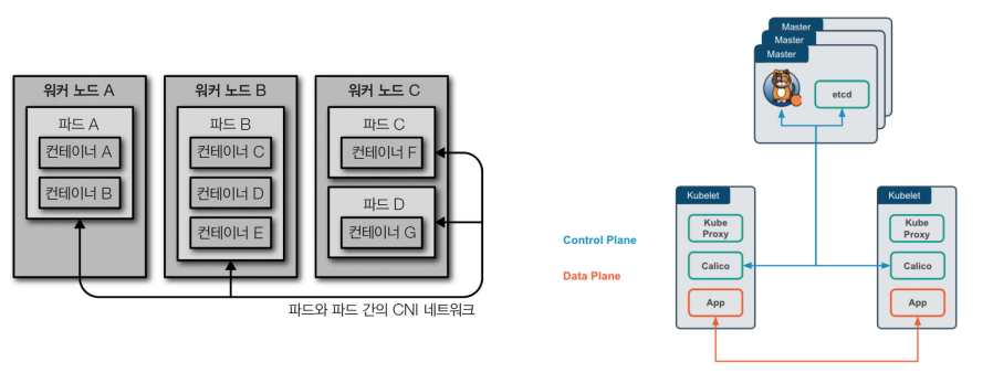 - 컨테이너 런타임(예: 도커)은 CNI 플러그인 실행파일(예: 칼리코)을 호출하여 컨테이너의 네트워킹 네임 스페이스에 인터페이스를 추가/ 제거