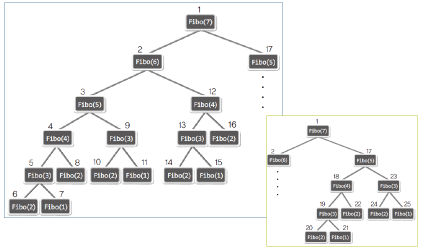 피보나치 수열에서 위와 같이 직접 값을 넣어서 호출 순서를 추적할 수 있겠지만 어려운 문제일수록 호출 관계조차 파악하기 힘들 수 있다. 따라서 문제가 있으면 재귀적 논리를 세우고 코드로 만들고 test case를 넣어봐야 한다. 이런 식으로 경험을 늘린다면 재귀적 사고를 늘릴 수 있을 것이다.