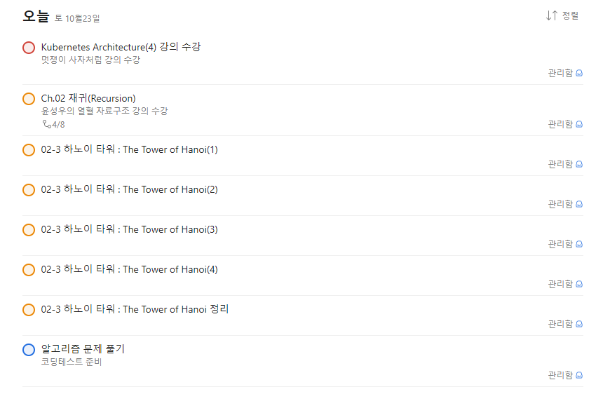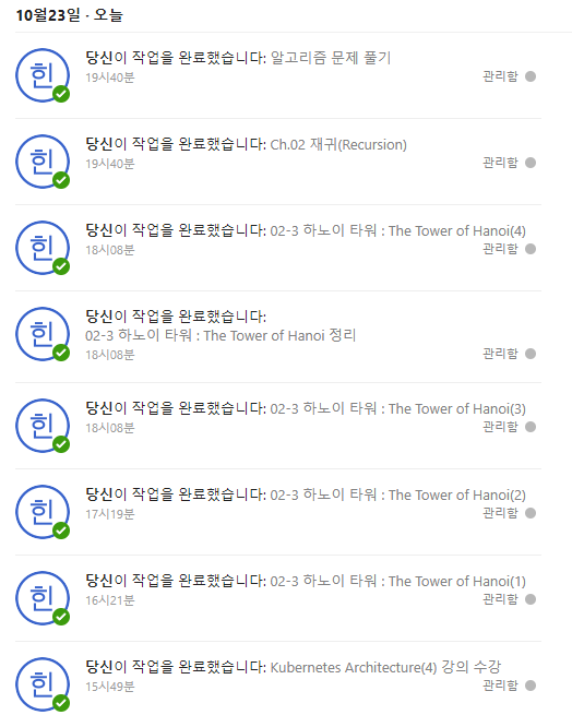 매일매일 이렇게 공부하니까 집중도 잘되고 생산성이 갈수록 높아지는 것 같다. 오늘 여유롭게 공부를 했는데 목표하는 만큼 해냈다. 쿠버네티스 강의에 소요되는 시간이 2~3시간이었는데도 오늘은 집중이 잘돼서 이해하고 넘어갈 수 있었다. 하노이 타워도 난이도가 있는 편이라서 2시간 정도 소요한 것 같고 알고리즘 문제도 2시간 정도 걸린 것 같다.