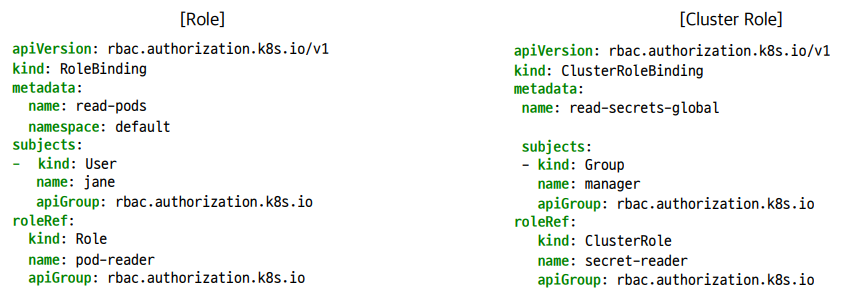 - RoleBinding, ClusterRoleBinding