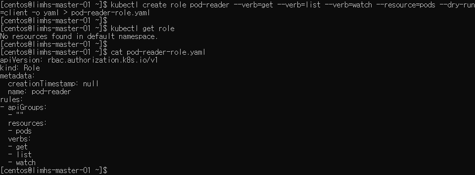 kubectl create rolebinding limhs-pod-reader --role=pod-reader --serviceaccount=defalut:limhs